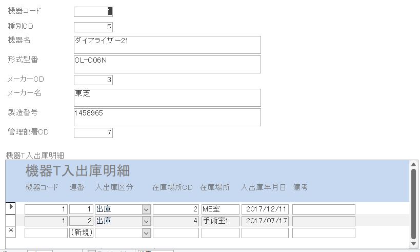 - 画面上半分はフォームウィザードで単票形式として機器テーブルから作っています。